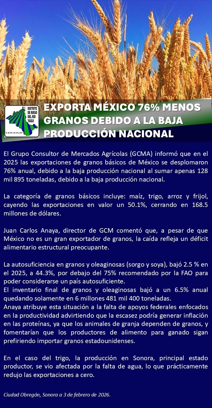 El Grupo Consultor de Mercados Agrícolas (GCMA) informó que en el 2025 las exportaciones de grano básicos de México se desplomaron 76% anual, debido a la baja producción nacional al sumar apenas 128 mil 895 toneladas, debido a la baja producción nacional