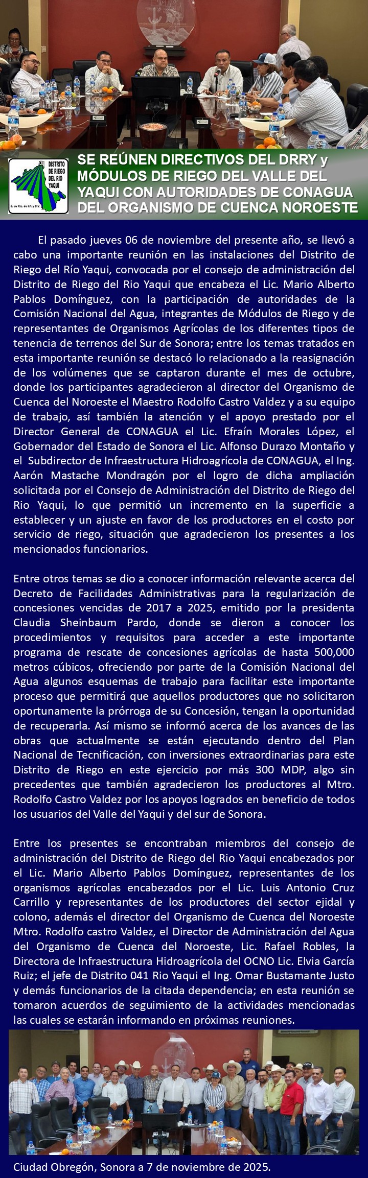 El pasado jueves 06 de noviembre del prsente año, se llevó a cabo una importante reunión en las instalaciones del Distrito de Riego del Río Yaqui, convocanda por el consejo de administración del Distrito de Riego del Río Yaqui que encabeza el Lic. Mario Alberto Pablos Domínguez